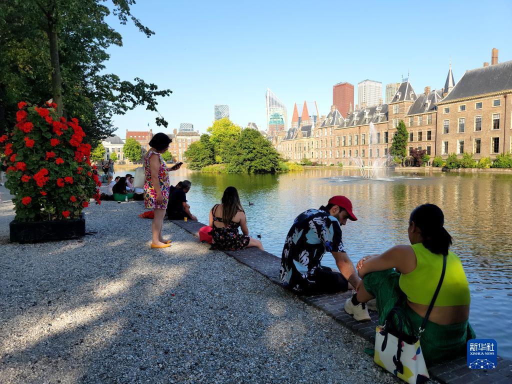7月19日,在荷兰海牙,人们在议会大厦附近的树荫下消暑纳凉。新华社记者 王湘江 摄