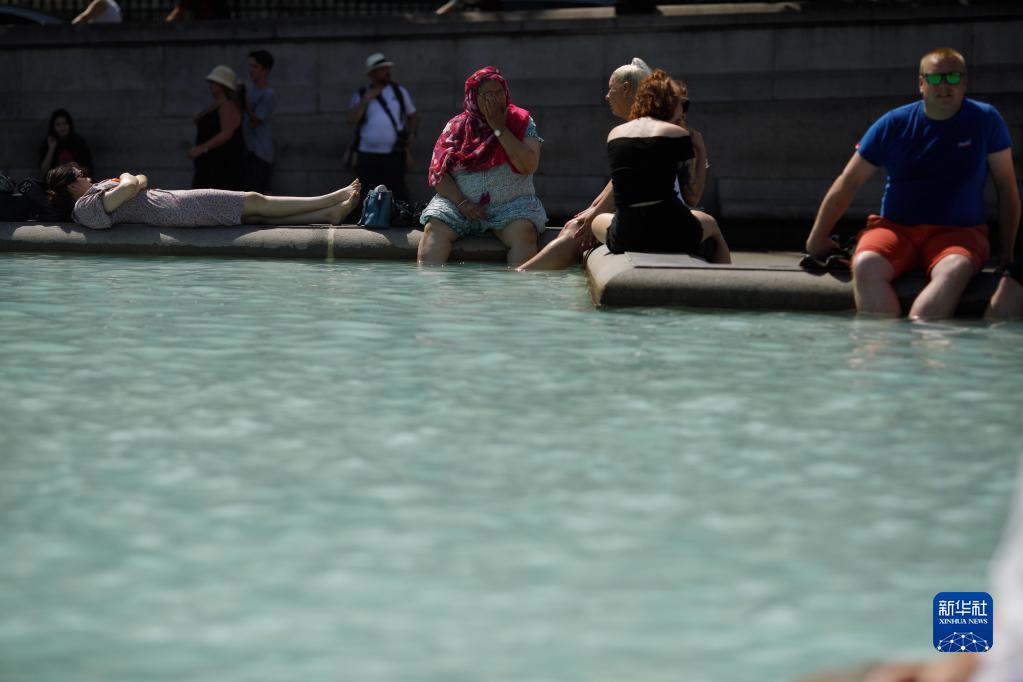 7月19日,人们在英国伦敦特拉法尔加广场喷泉旁纳凉。当日11时,英国达到39.1摄氏度的历史最高温度。新华社发(蒂姆·爱尔兰摄)