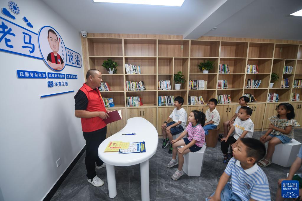 7月20日,在锦南街道锦溪社区党群服务中心,党员志愿者马建明(左一)在给社区托管班里给孩子们进行普法教育和暑期安全教育。