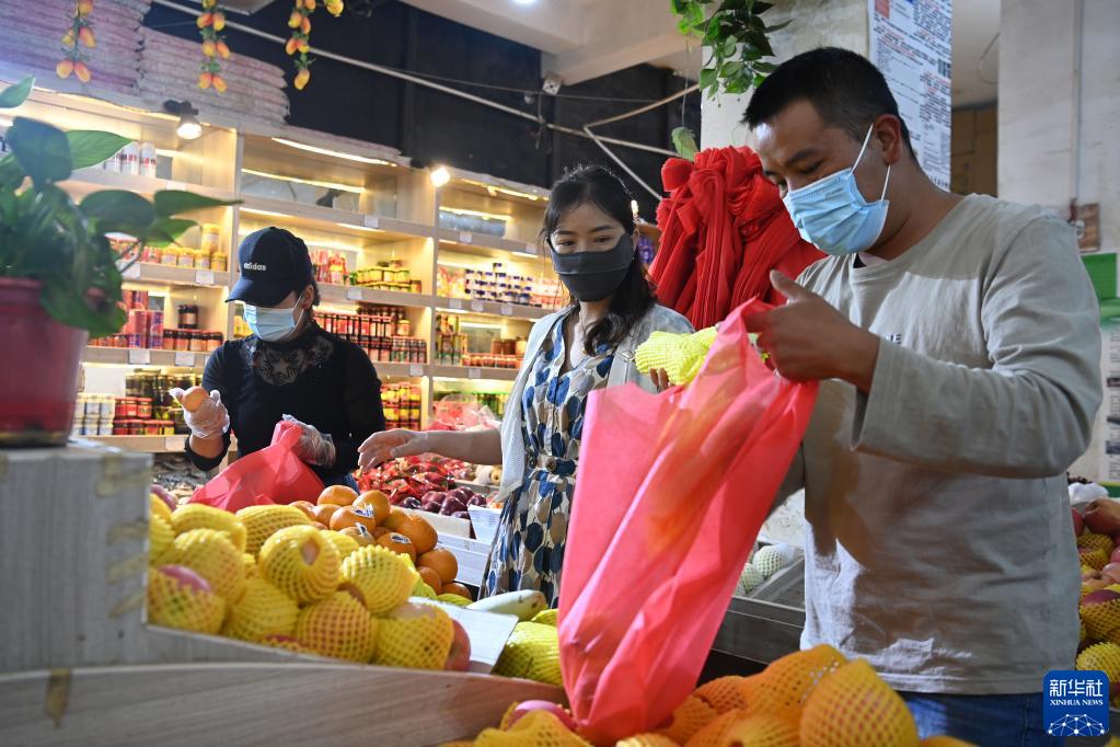 7月19日,在玉树市一农贸市场,顾客使用环保购物袋购买水果。