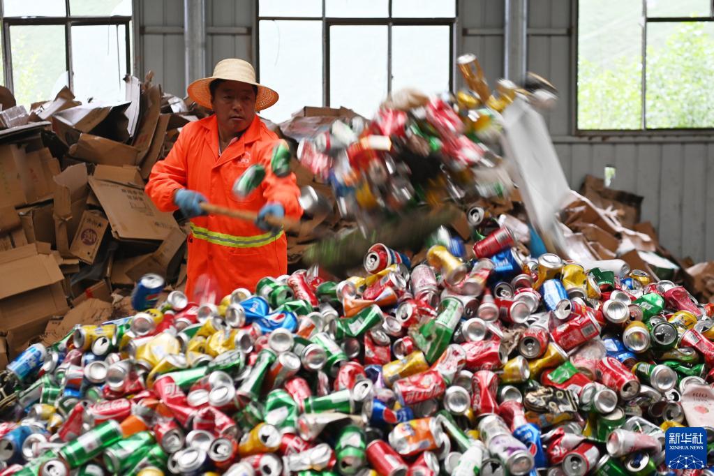 7月18日,在玉树市净洁助残垃圾分类厂,工作人员整理可回收利用的铝制品。
