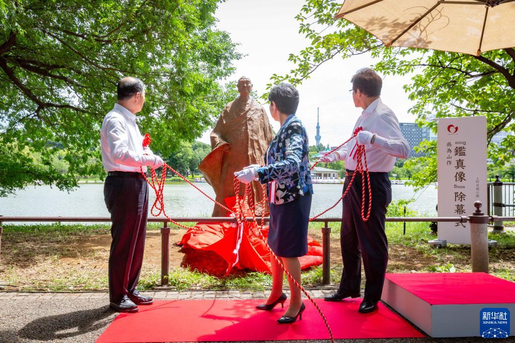 7月20日,在日本东京上野公园“不忍池”湖畔,中日嘉宾共同为鉴真铜像揭幕。新华社发(山崎裕一摄)
