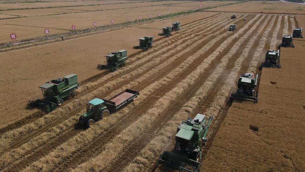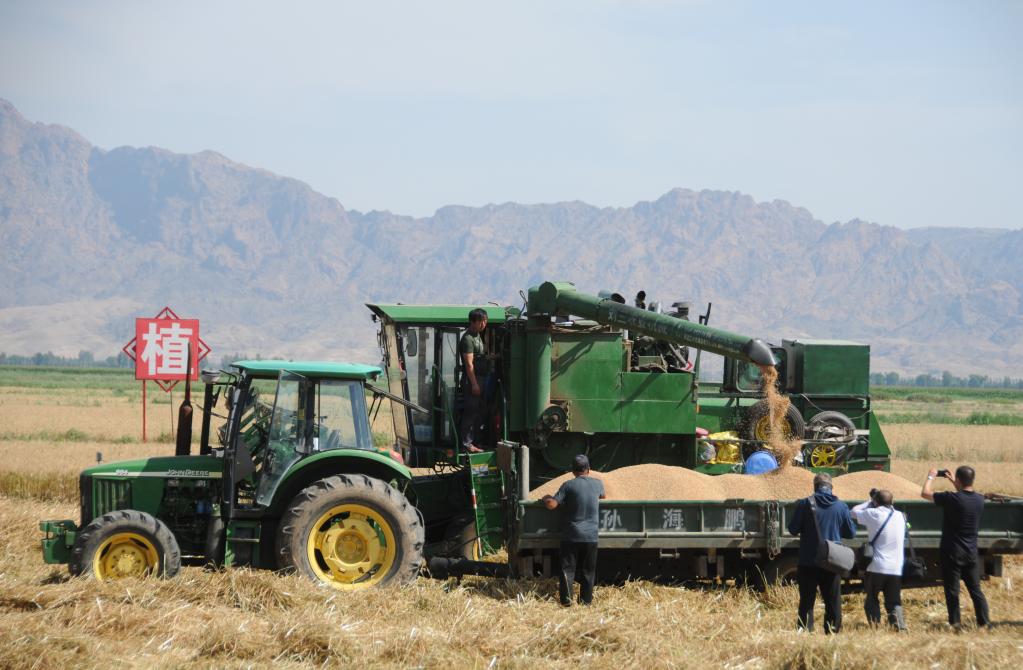 临河区新华镇十万亩高产高效粮食生产示范园区开展麦收工作。新华社记者 李云平摄