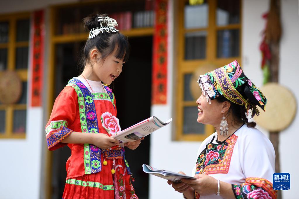 7月19日,湖南省邵阳市城步苗族自治县长安营镇民族文化传播服务中心,一名小朋友在向“六月六”山歌节市级传承人陈岩花(右)学习唱山歌。