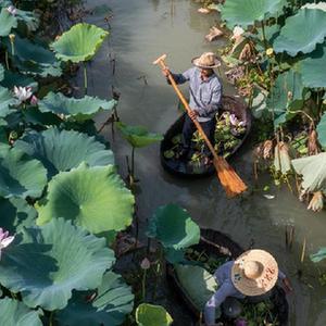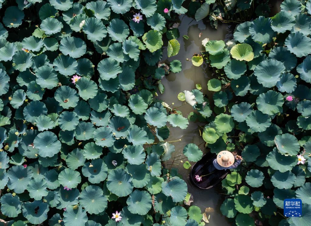 盛夏时节,浙江省湖州市吴兴区东林镇的数百亩荷塘内荷花绽放,莲蓬也已到采摘期,村民们划着菱桶在荷塘内采摘,开启水乡丰收季。东林镇立足水乡特色资源和优势,荷塘面积总计800多亩,产出荷花、莲蓬、莲藕,亩均收益3000元左右,是当地百姓增收的特色种植业之一。