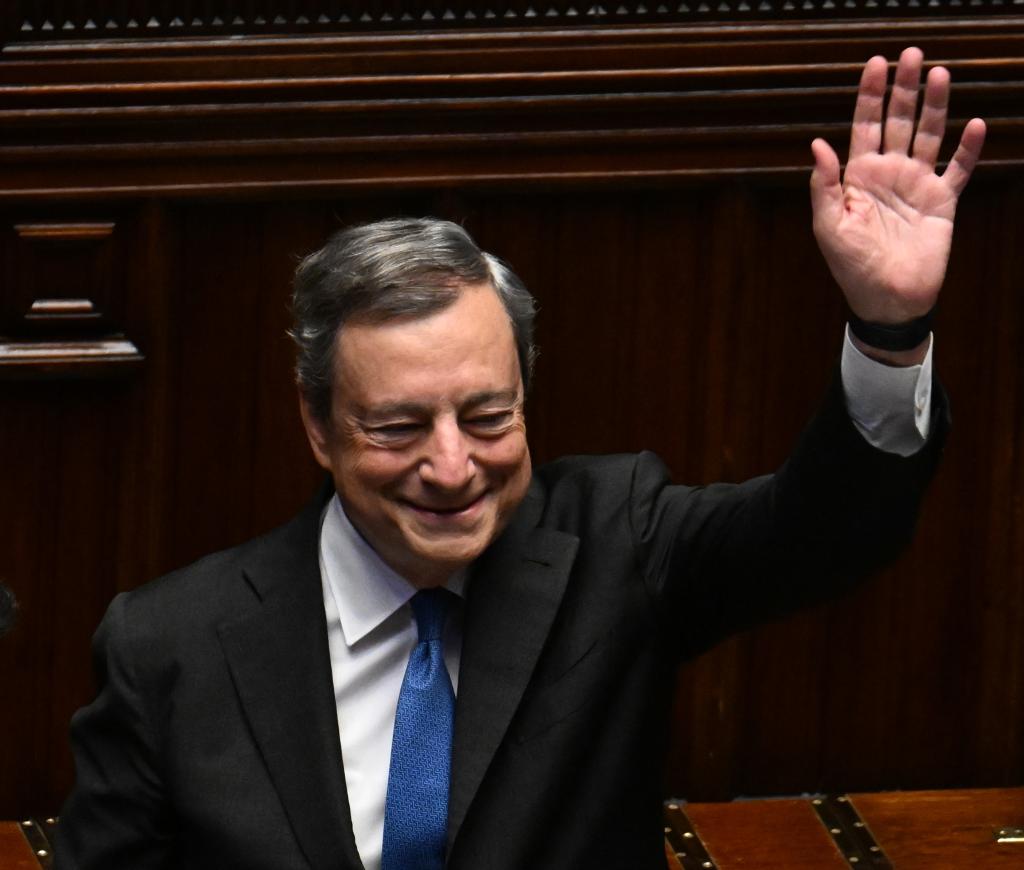 7月21日,在意大利罗马,意大利总理马里奥·德拉吉在众议院发表讲话后挥手致意。新华社发(阿尔贝托 摄)