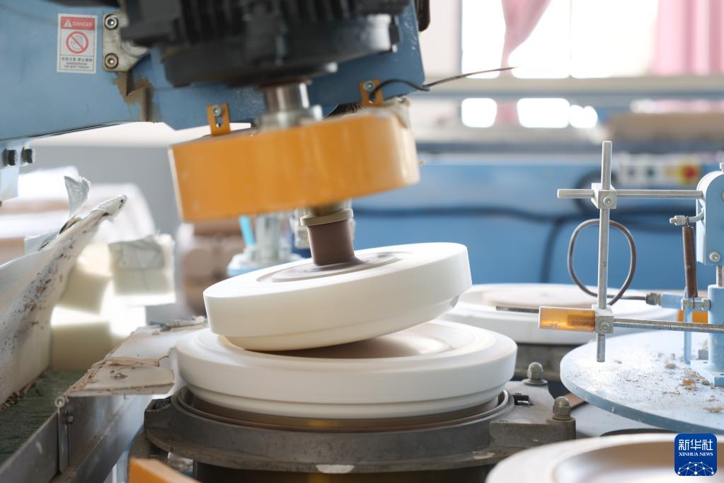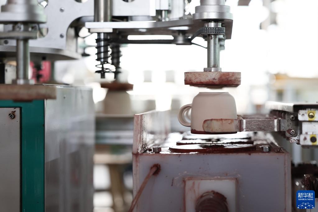7月6日,在湖南华联溢百利瓷业有限公司的智能制造车间,自动滚压机在制作泥坯。新华社记者 薛宇舸 摄
