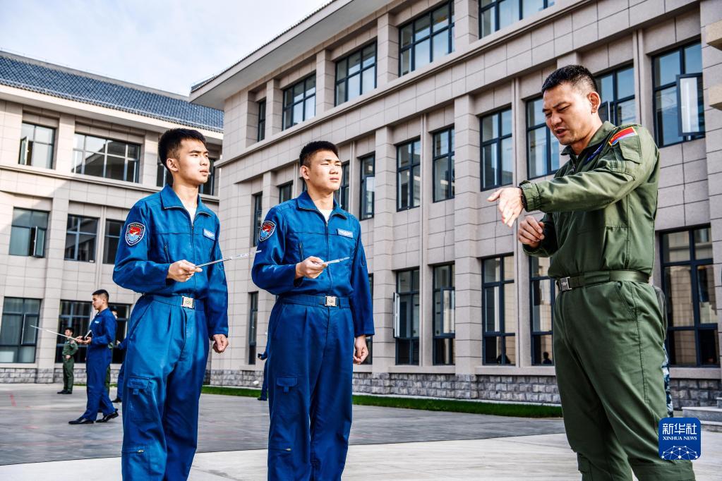 空军首批歼-10飞行学员在石家庄飞行学院某旅演练场与教官进行地面演练(2021年9月9日摄)。新华社发(李敏 摄)