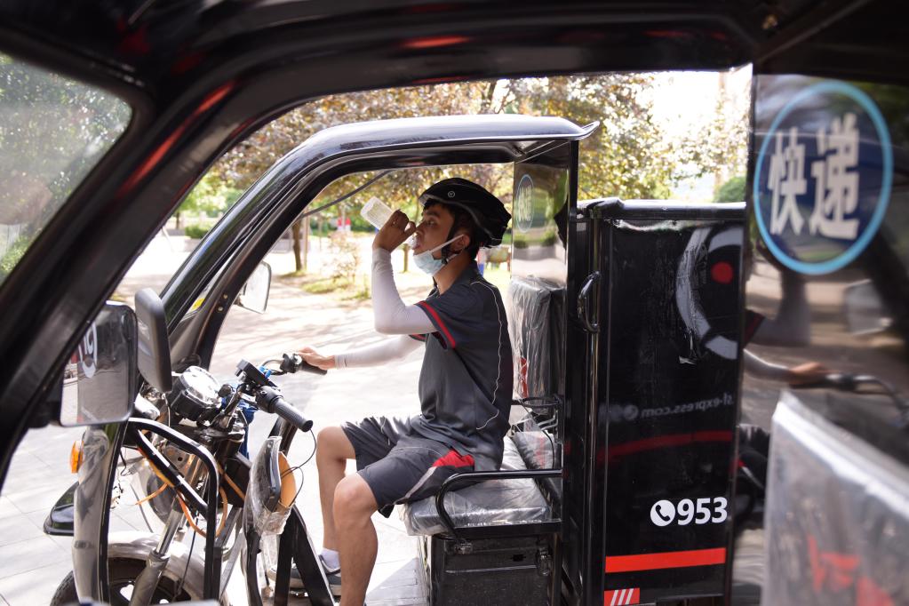2022年7月12日,在贵州省黔东南苗族侗族自治州岑巩县城区,快递员在工作间隙喝水。新华社发