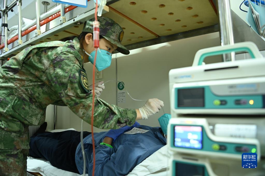 7月22日,重症救治组医护人员在卫生列车重症监护车厢进行床旁救护演练。新华社发(曾理 摄)