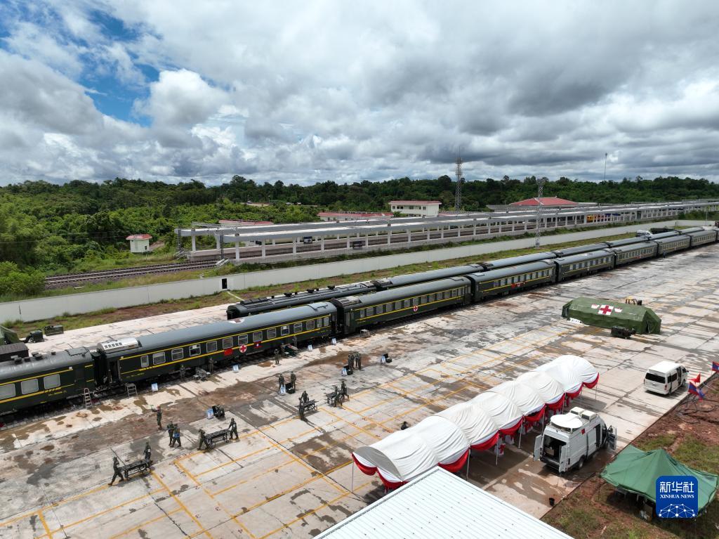7月22日,在中老铁路老挝蓬洪站,“和平列车-2022”联合演训有序展开(无人机照片)。新华社发(曾理 摄)