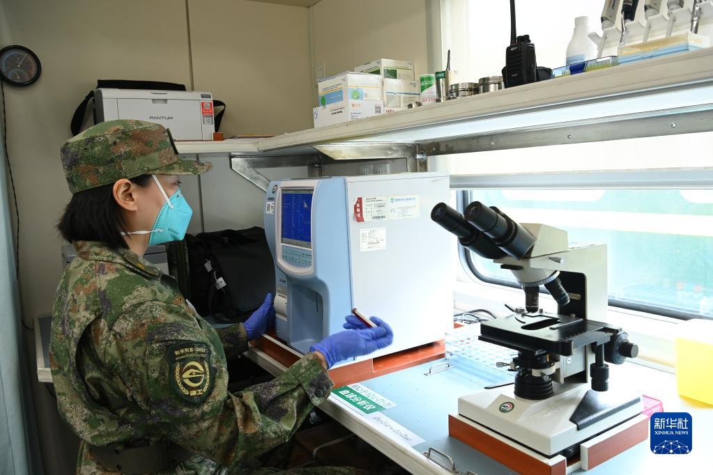 7月22日,检验技师在卫生列车医技保障工作区开展生化免疫检测演练。新华社发(曾理 摄)