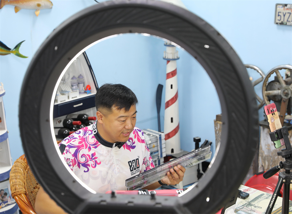 7月21日,在固安县礼让店乡一家渔具销售网店,工作人员在直播平台上推介渔具产品。新华社记者 门丛硕 摄