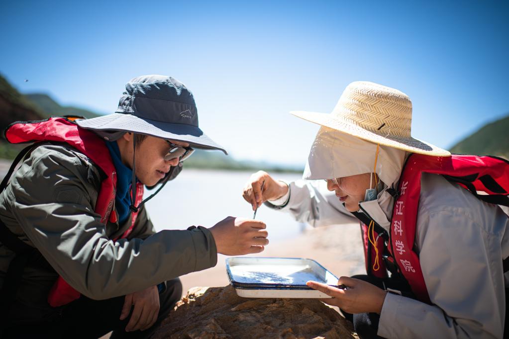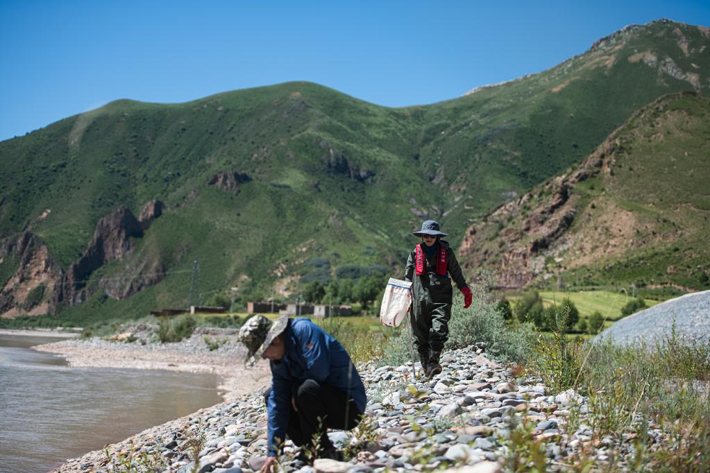 7月24日,长江科学院科考队员刘晗(右)在澜沧江源区的扎曲采集鱼类样本。新华社记者 肖艺九 摄
