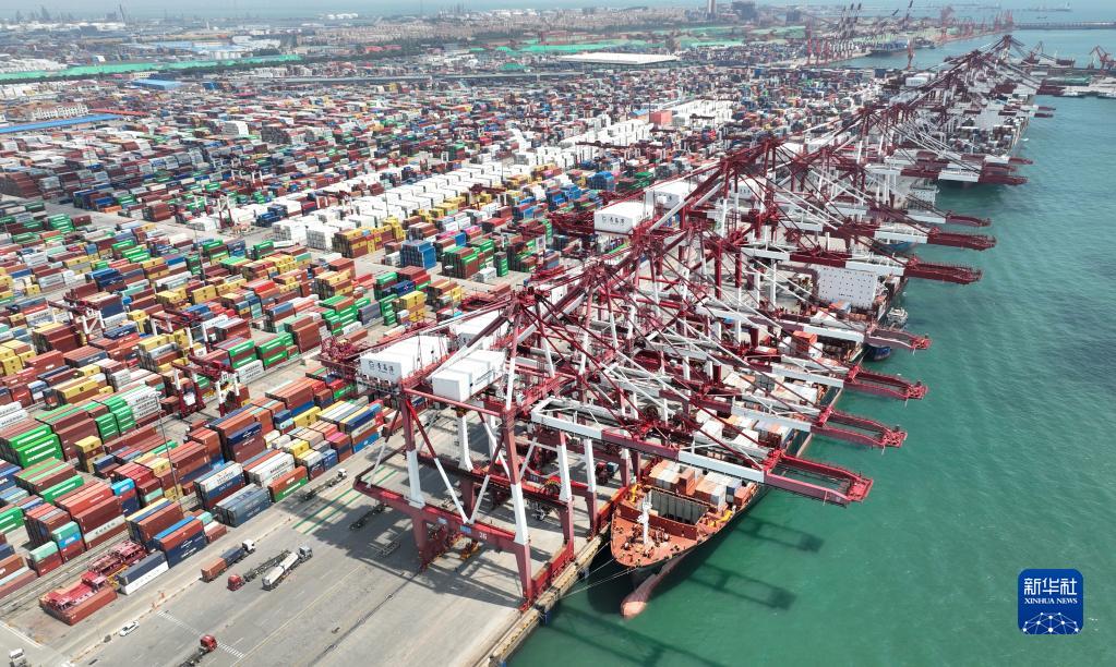 山东港口青岛港前湾港区一派繁忙景象(2022年6月15日摄,无人机照片)。新华社记者 李紫恒 摄