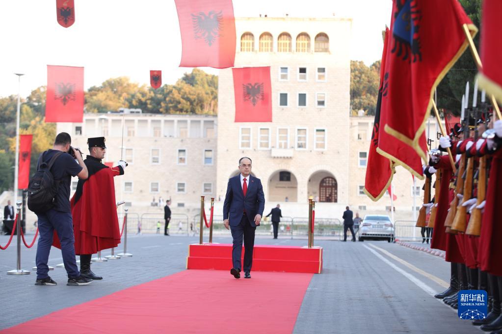 7月24日,在阿尔巴尼亚地拉那,阿尔巴尼亚总统贝加伊在总统府的就职仪式上检阅仪仗队。新华社发(根特·奥努齐摄)