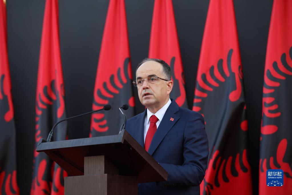 7月24日,在阿尔巴尼亚地拉那,阿尔巴尼亚总统贝加伊在总统府的就职仪式上发表讲话。新华社发(根特·奥努齐摄)