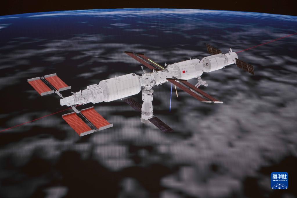 7月25日在北京航天飞行控制中心拍摄的问天实验舱与空间站组合体交会对接。这是问天实验舱成功对接于天和核心舱前向端口的模拟图像。新华社记者 郭中正 摄
