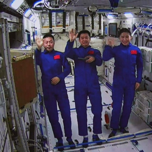 7月25日在北京航天飞行控制中心拍摄的神舟十四号航天员乘组进入问天实验舱。航天员陈冬(中)、刘洋(右)、蔡旭哲进入问天实验舱。新华社记者 郭中正 摄