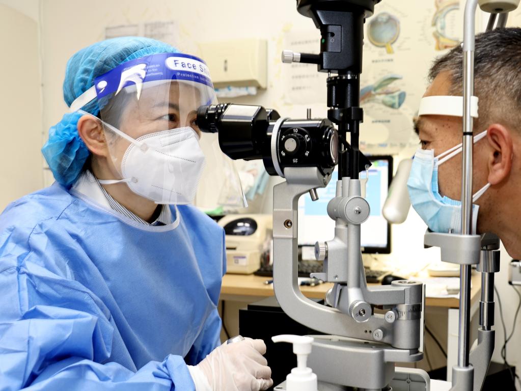 资料图:上海市第十人民医院眼科主任医师邹俊(左)为患者检查。新华社记者 陈建力 摄