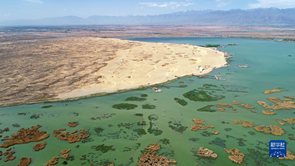 半沙半水的宁夏沙湖景区(2022年4月30日摄,无人机照片)。