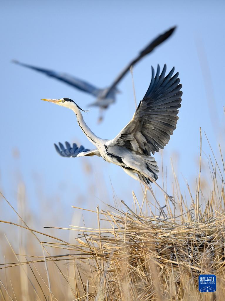 苍鹭在宁夏沙湖景区飞翔(2022年4月1日摄)。