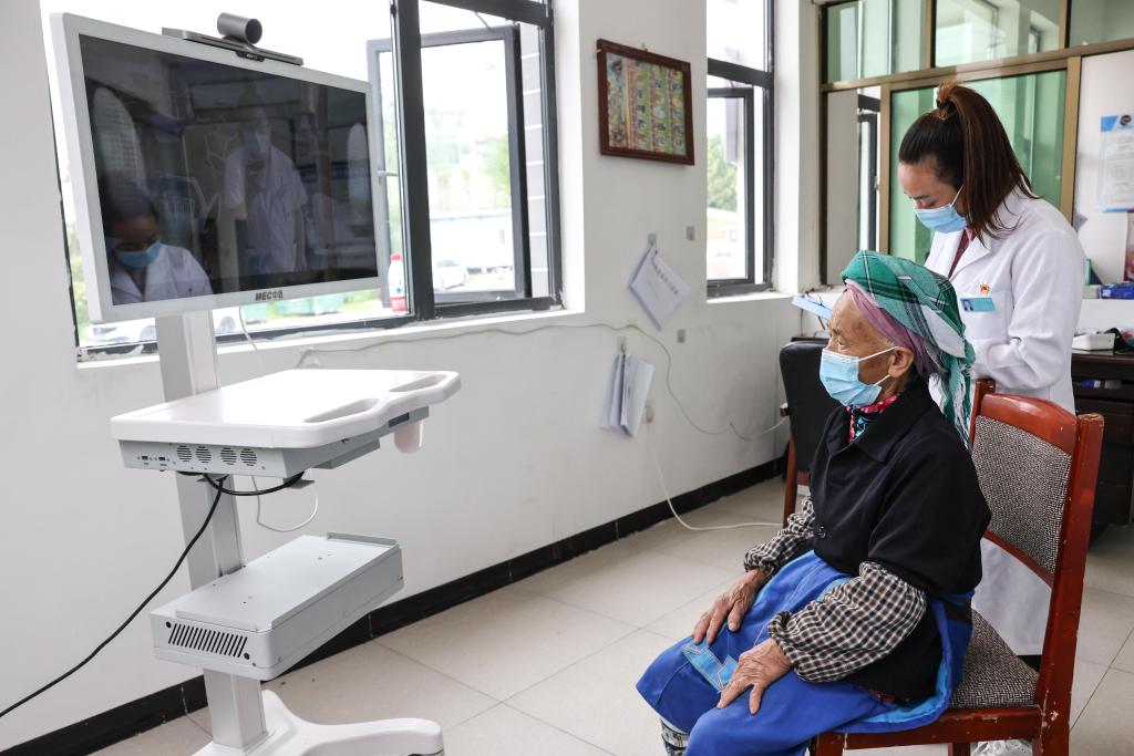 6月7日,在贵州省龙里县龙山镇团结村卫生室,村医陈莉(右)协助村民陈志珍通过远程诊断系统问诊。新华社记者 欧东衢 摄