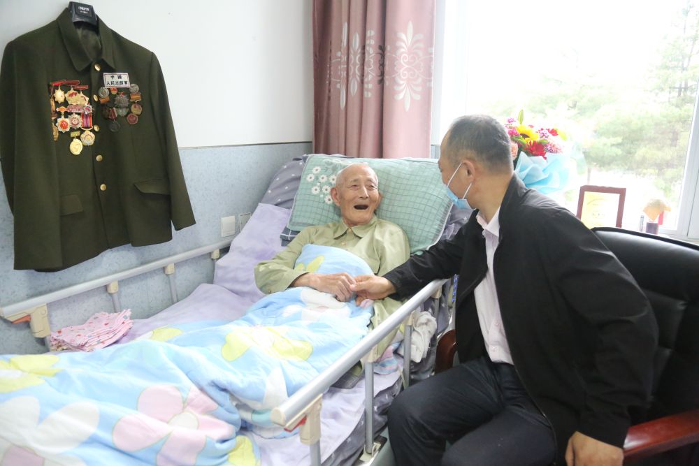 2021年6月1日,抗美援朝老战士孙景坤在丹东光荣院与院长交谈。新华社记者杨青摄