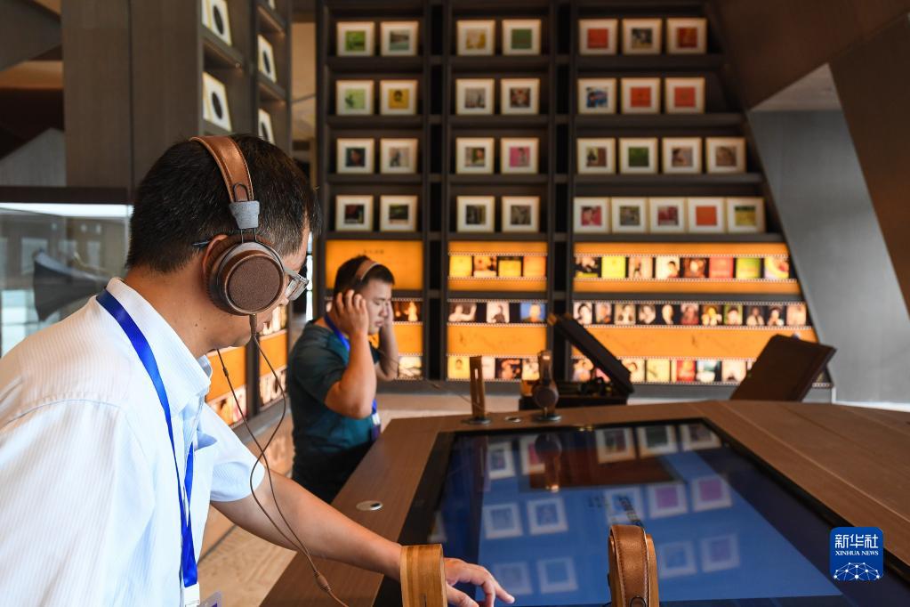7月30日,参观者在中国国家版本馆广州分馆中国流行音乐版本展示区体验试听。