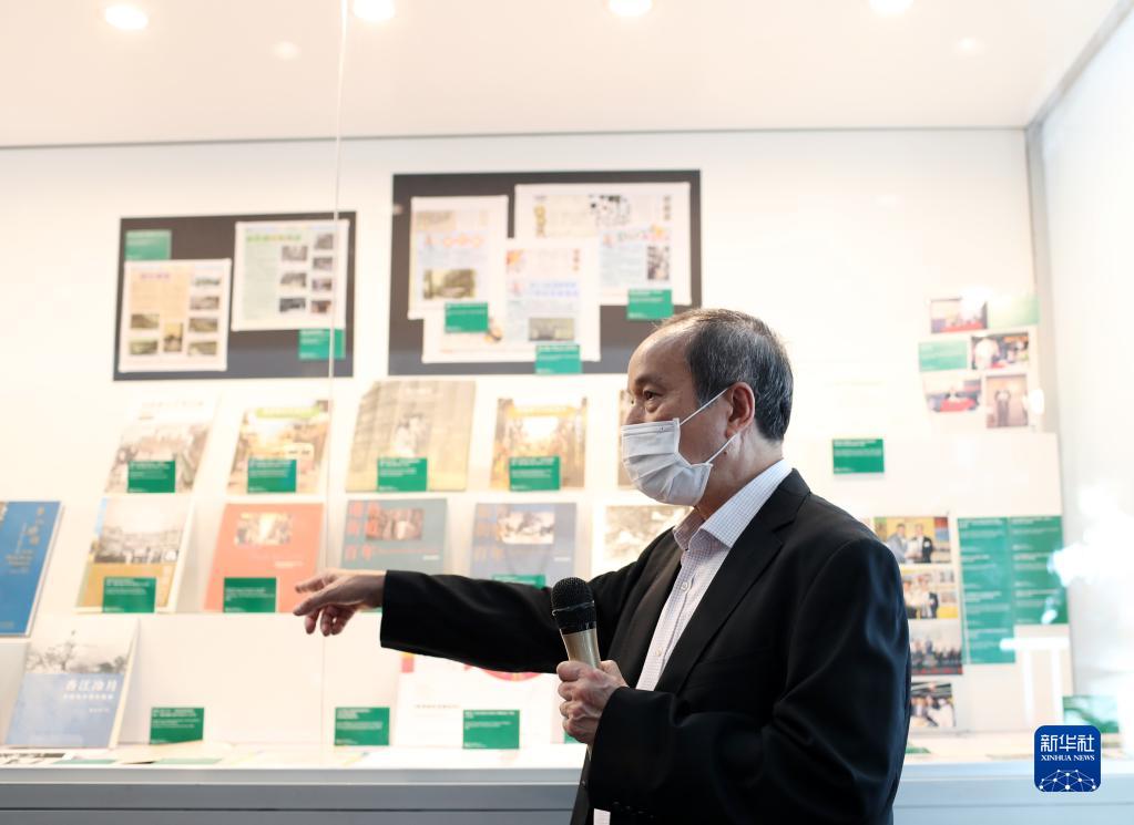 郑宝鸿为香港书展做展览介绍(7月19日摄)。新华社记者 李钢 摄