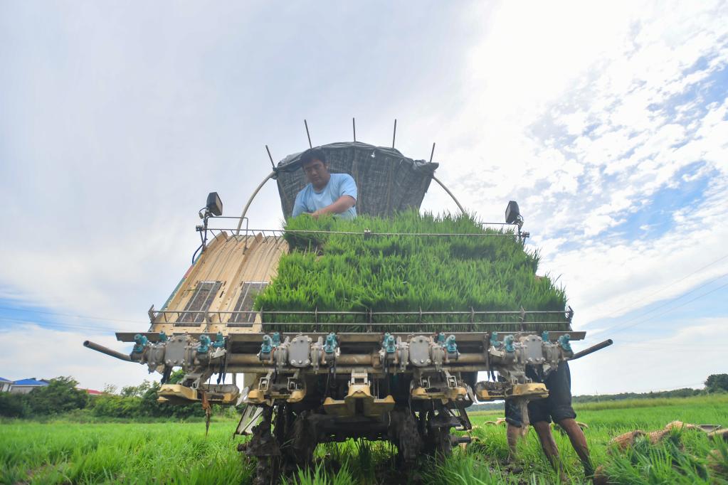 2022年7月21日,在湖南省长沙市望城区茶亭镇苏廖村,农民把水稻秧苗搬运到插秧机上。新华社记者陈泽国 摄