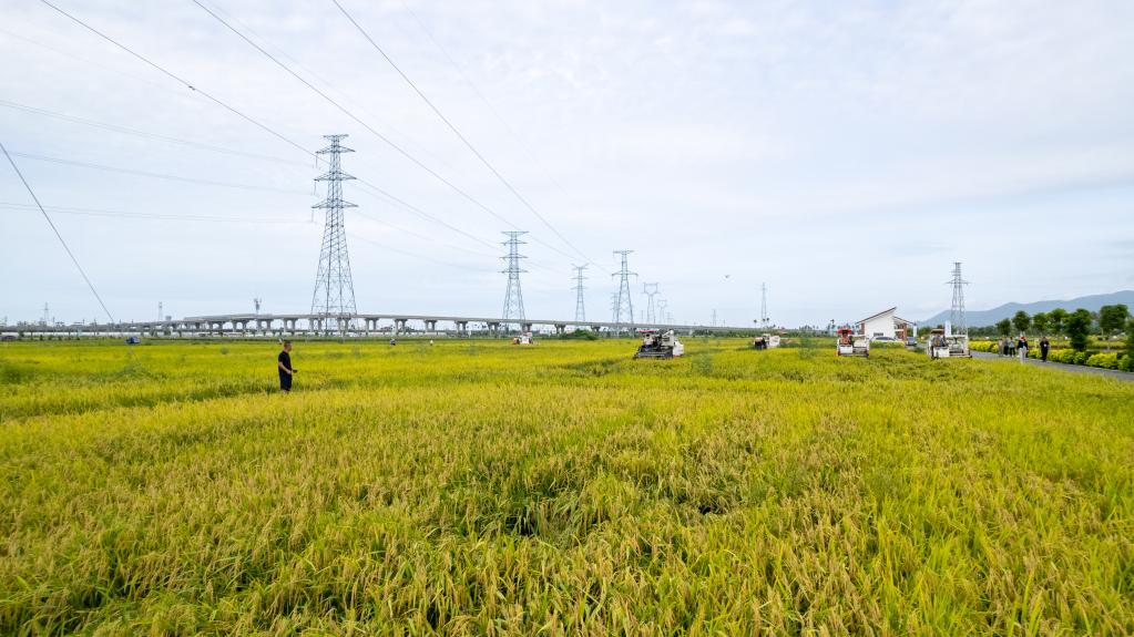 2022年7月4日,在海南省三亚市崖州区(坝头)南繁公共试验基地,农机手在收割水稻(无人机照片)。新华社记者胡智轩 摄