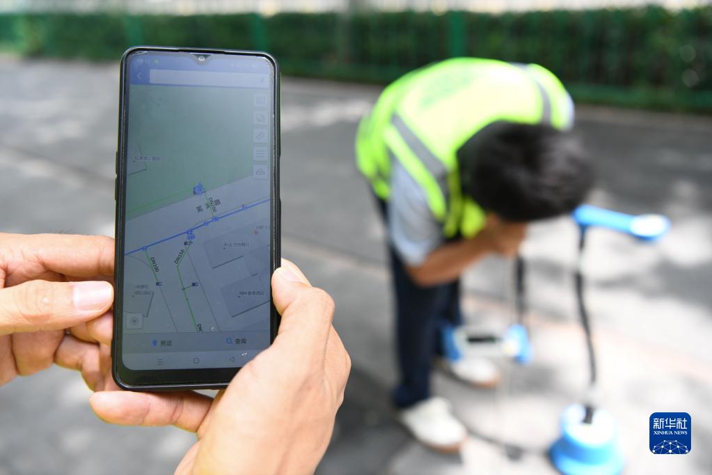 7月29日,在合肥市芜湖路,张杨(右)和同事郭相东在常态化巡检中通过手机判断供水管道的线路。