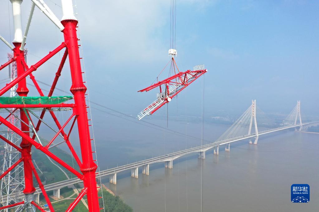 8月1日,安徽送变电工程有限公司施工人员在池州长江大跨越南岸跨越塔封顶施工现场作业(无人机照片)。