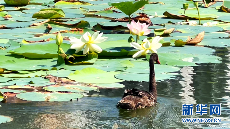 近日,安徽省阜阳市文峰公园的荷花竞相盛开,花香四溢。湖面上,黑天鹅在荷间追逐嬉戏,悠然自得,为夏日增添了灵动的色彩,吸引不少市民驻足观赏。