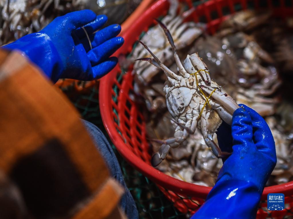 8月2日,在舟山国际水产城的商铺内,工作人员在分拣、捆扎首批捕获的梭子蟹,准备销往各地。