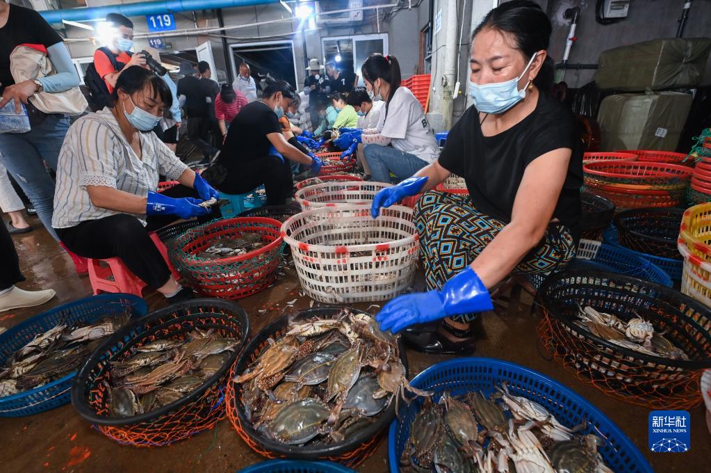 8月2日,在舟山国际水产城的商铺内,工作人员在分拣、捆扎首批捕获的梭子蟹,准备销往各地。