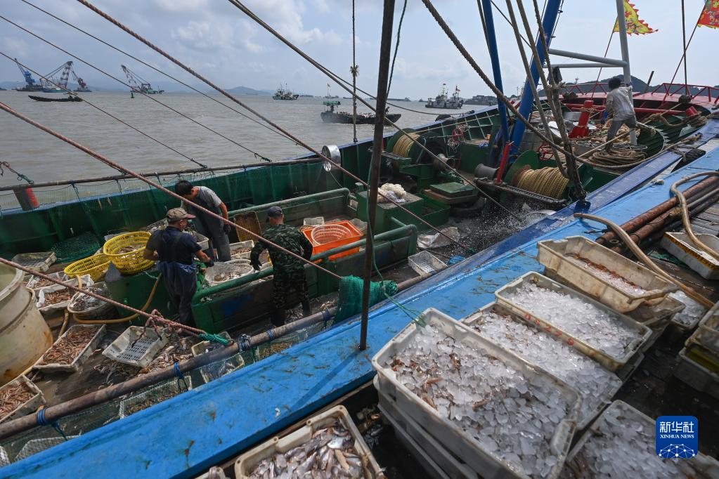 8月2日,在舟山国际水产城码头,首批回港的渔船带回了捕获的梭子蟹等,渔民在船上分拣渔获。