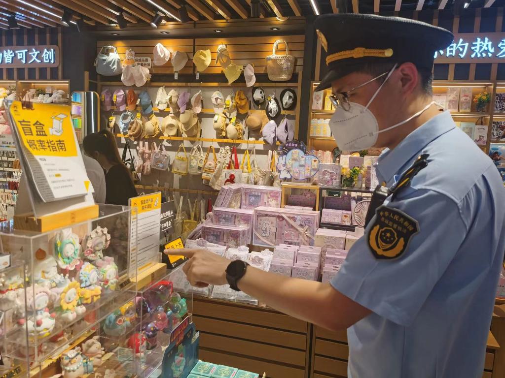 8月2日下午,上海市徐汇区市场监管局组织开展盲盒检查,图为执法人员检查盲盒销售标签。(受访对象提供)
