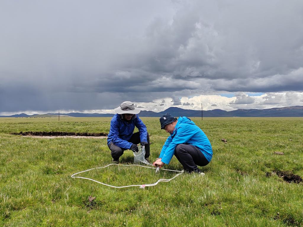 7月17日,科考队员任斐鹏(右)和孙宝洋在观测自然状态下高寒草甸生态系统状况。(受访者供图)