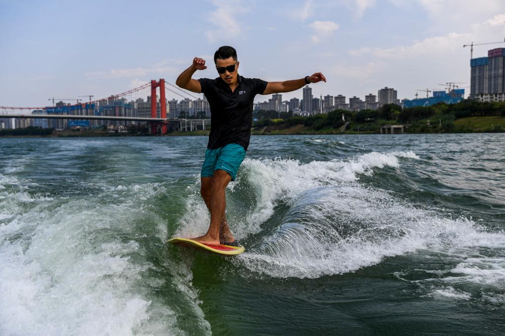 ↑一位市民在南宁市邕江上体验尾波冲浪(7月27日摄)。
