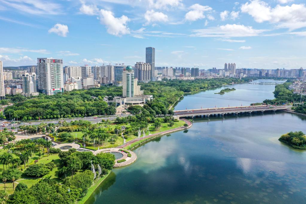 ↑这是南宁市南湖及周边建筑(2021年6月14日摄,无人机照片)。