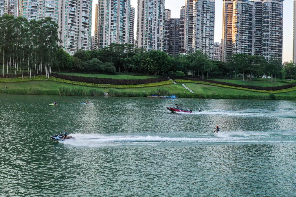 ↑市民在南宁市邕江上体验水上运动(7月27日摄,无人机照片)。