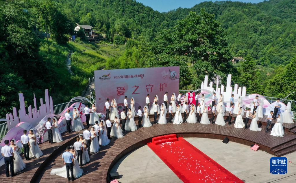 8月4日,新人在重庆万州三峡恒合旅游度假区参加集体婚礼(无人机照片)。