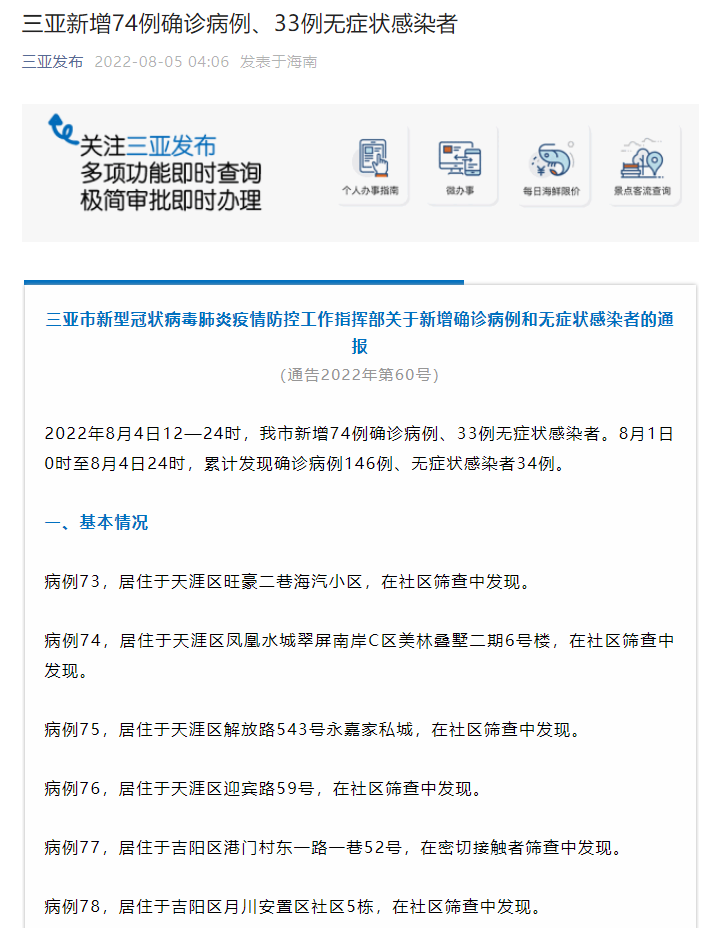 2022年8月4日12时—24时,三亚市新增74例确诊病例、33例无症状感染者。8月1日0时至8月4日24时,累计发现确诊病例146例、无症状感染者34例。