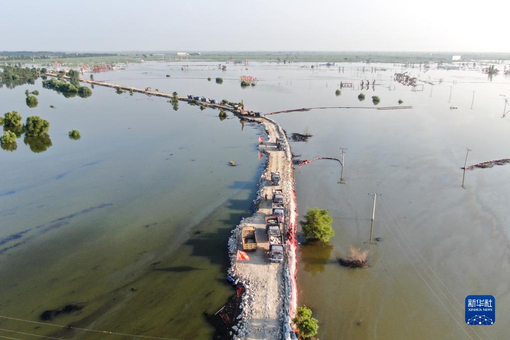 8月5日,抢险人员运送物料前往绕阳河溃口处(无人机照片)。
