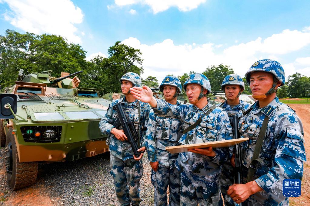 空降兵某旅二营政治教导员余海龙(中)带领官兵进行识图训练(2022年7月11日摄)。新华社发(张朋倍 摄)