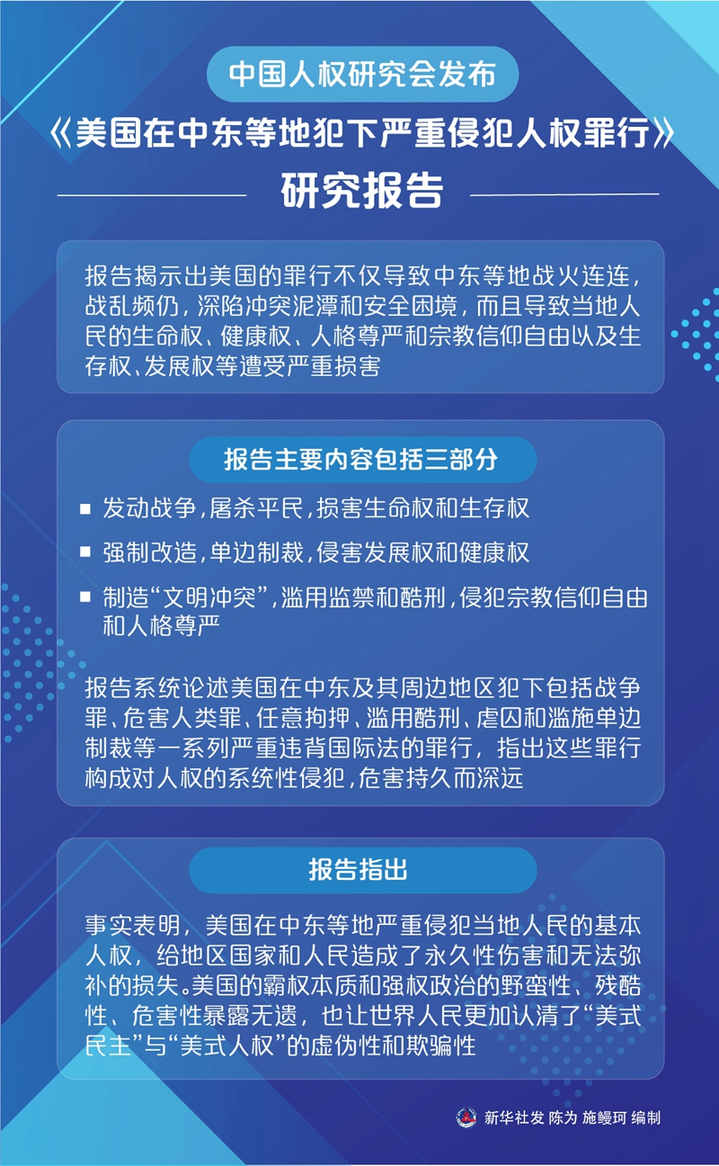 新华社北京8月9日电 中国人权研究会9日发布《美国在中东等地犯下严重侵犯人权罪行》研究报告。报告揭示出美国的罪行不仅导致中东等地战火连连,战乱频仍,深陷冲突泥潭和安全困境,而且导致当地人民的生命权、健康权、人格尊严和宗教信仰自由以及生存权、发展权等遭受严重损害。