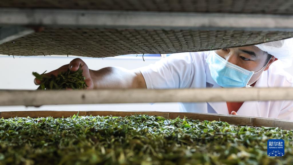 8月9日,工作人员在石阡县枫香乡梨子园村茶叶加工厂内对茶青进行摊晾。
