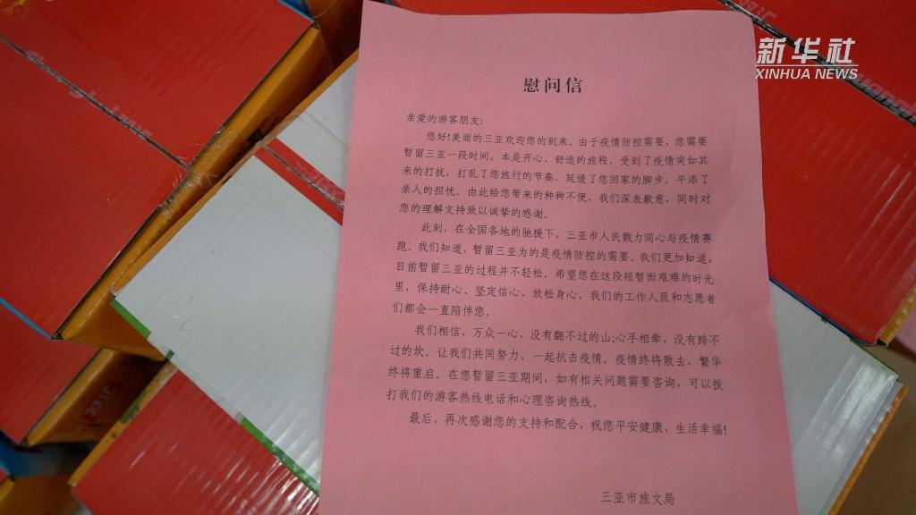 在“爱心包”里,记者看到了一封来自三亚市旅文局给滞留游客的慰问信,信中写道:“目前暂留三亚的过程并不轻松,希望您在这段短暂而艰难的时光里,保持耐心、坚定信心、放松身心,我们的工作人员和志愿者们都会一直陪伴您。”